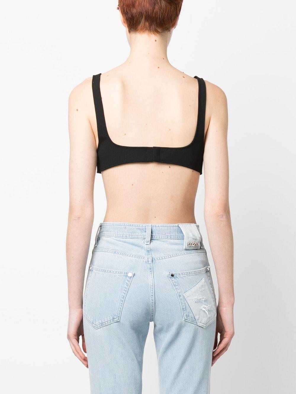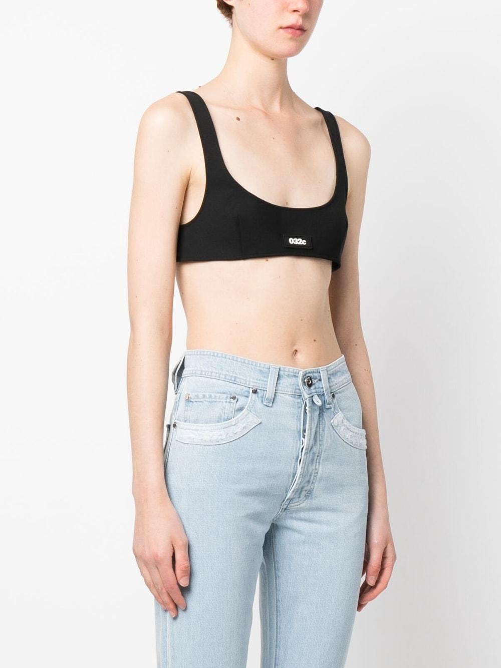logo-patch cropped top from 032c featuring black, wool blend, logo patch to the front, U-neck, thin shoulder straps, open back and cropped.
