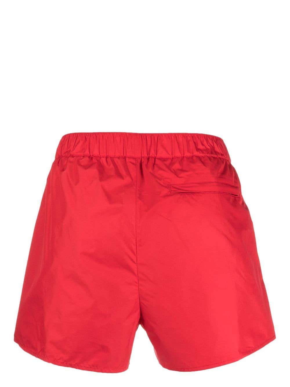 logo-patch elasticated swim shorts from 032c featuring bright red, logo patch to the front, elasticated waistband, two side welt pockets, rear zip-fastening pocket, thigh-length and mesh lining.