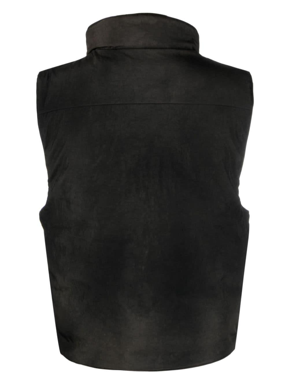 funnel-neck padded gilet from 032c featuring duck down, padded design, funnel neck, front zip fastening, sleeveless, front zip fastening pockets, straight hem, dark brown and cotton.